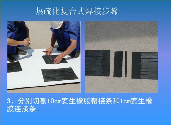 第六步:將1cm寬生橡膠連接條放入接縫中間。然后將10cm寬的生橡膠幫接條平鋪在止水帶的打磨面上,保證接縫兩側(cè)寬度均等。